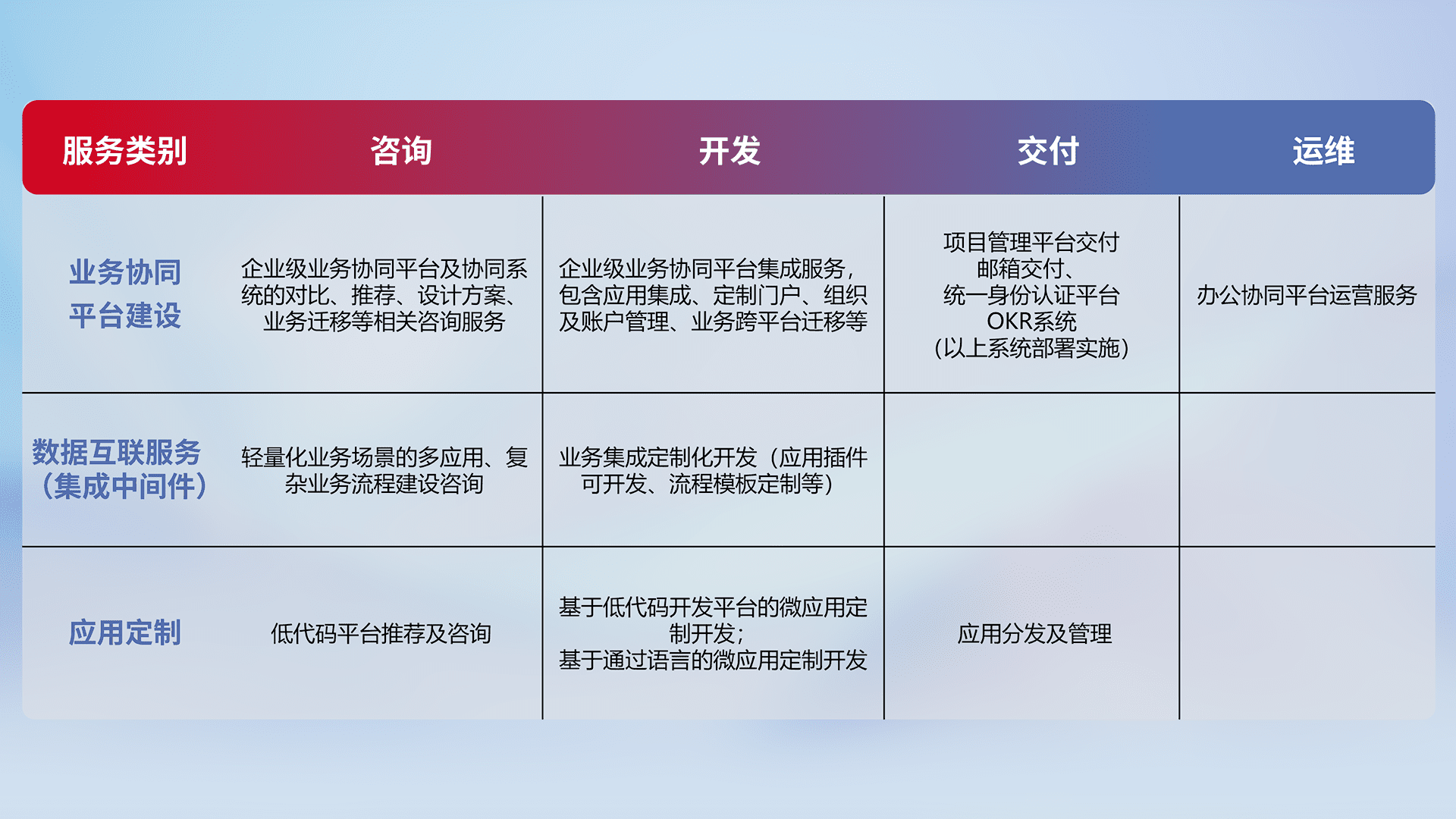针对钉钉、、、、企微、、、、IDaas等平台级产品提供产品的规划、、方案、、交付、、定制化开发等服务,,,实现如统一协同办公、、、、智能客户服务、、混合会议管理、、智能数据查询、、、、等业务场景,,实现数字化转型。。。
